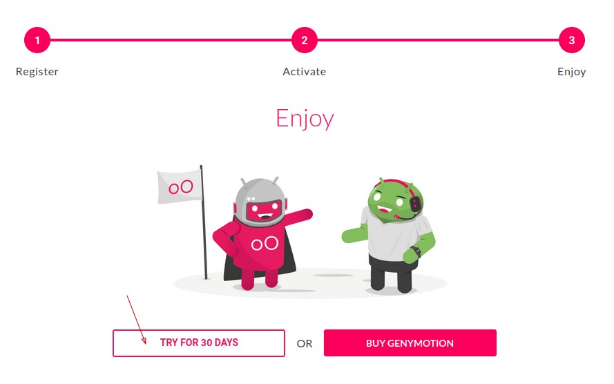 In some rare occasions, you may get an error when clicking on the activation link ("Invalid or expired activation link"), yet the account is activated (see I get the error "Invalid or expired activation link" after clicking on the activation link (Genymotion Desktop)). If this happen, please use this form to request a trial.